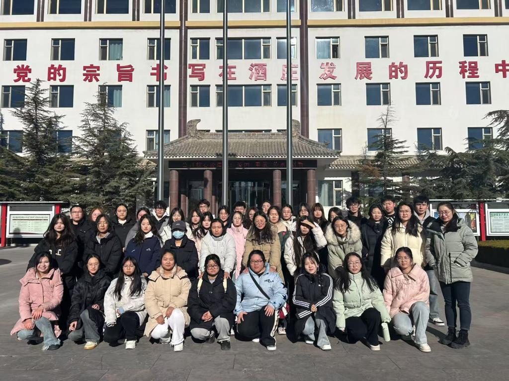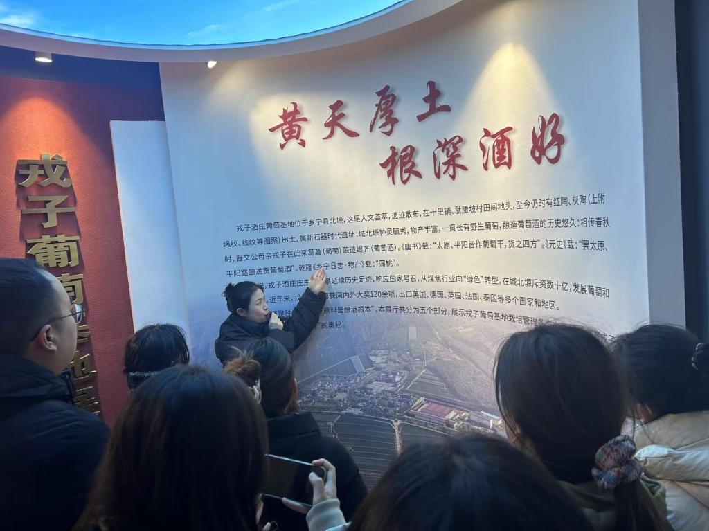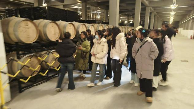 师生们稍作休整,继续前往位于临汾市乡宁县的山西戎子酒庄进行参观学习。在酒庄导游的带领下,学生们参观了酒窖、加工厂和品酒室等景点,详细了解了葡萄酒的生产工艺与技术。从葡萄品种的选择、种植管理到葡萄酒的发酵、压榨、澄清、陈酿等各个环节,学生们都听得津津有味,对酿酒的复杂性和精细性有了更深刻的认识。在品酒室,学生们品尝了多种不同口味的酒品,从清新的果酒到醇香的红酒,每一款都让人回味无穷。酒庄专业讲解员还教授了学生们如何品鉴葡萄酒,包括观察酒色、闻香、品味等步骤,这极大地提升了学生们对葡萄酒的感官认知和理解。